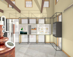 八郷蒸溜所の付属施設として今回新たに開業する「八郷蒸溜所 ビジターセンター」では、これまで述べてきたウイスキー製造に至るまでの木内酒造の酒造りの歴史や、地域環境に配慮した循環型の各種取り組みを図や紹介文を交えた展示パネルで紹介するコーナーをはじめ、これまでに販売してきた数量限定品を含めた「日の丸ウイスキー」の各種ラインナップも、ご購入いただける販売コーナーも設けました。自社製の生ハム「常陸野ハム BARREL SMOKE」と日の丸ウイスキーを一緒にお楽しみいただける飲食コーナー、八郷蒸溜所限定のウイスキーも取り扱い予定で、いつ訪れても何回も楽しめる、魅力ある空間で皆様のお越しをお待ちしております。
