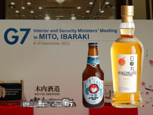 木内酒造株式会社(茨城県那珂市)は、茨城県水戸市で2023年12月8日から10日までの3日間で開催された「G7茨城水戸内務・安全担当大臣会合」(場所:水戸市民会館、以下、G7水戸会合)の初日の歓迎レセプション(水戸プラザホテル)にて、菊盛「ピュア茨城 純米大吟醸 風と水」、常陸野ネストビール「ホワイトエール」「だいだいエール」、「木内梅酒」、日の丸ウイスキー「KOME」「2023 CELEBRATION」を、晩餐会(The 迎賓館 偕楽園 別邸)にて「木内梅酒」、日の丸ウイスキー「The 1st Barrels」をそれぞれ提供いたしました。