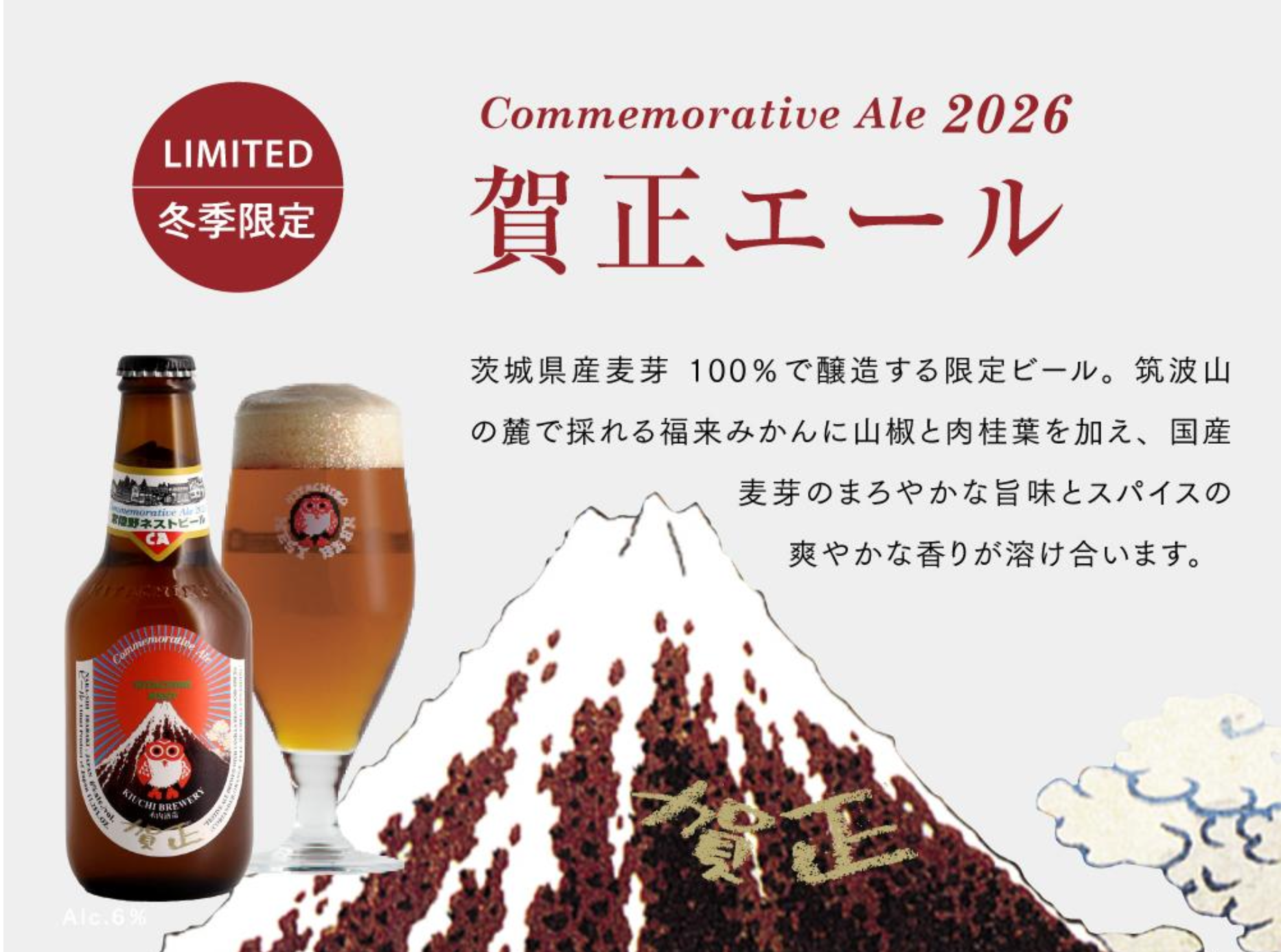 木内酒造株式会社(茨城県那珂市)は、茨城県産の国産麦芽 100%と、国産のスパイスを用いて醸造した冬季限定「常陸野ネストビール 賀正エール 2026」を、2025 年 11 月上旬より数量限定で発売開始いたします。