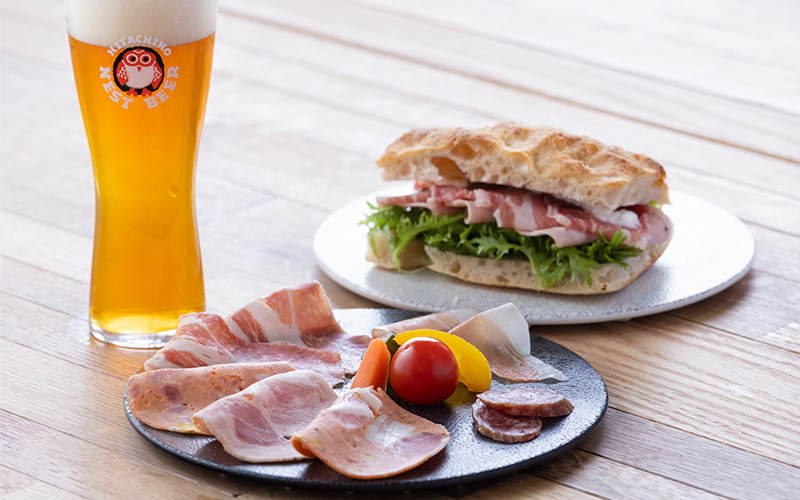 豊富なラインナップの常陸野ネストビールと、茨城県産の銘柄豚を自社のハム工房で加工した生ハムやベーコンソーセージをメインとしたフードメニューを提供。ビールや生ハムはテイクアウトも可能。気軽に立ち寄れる本格クラフトビアバー。